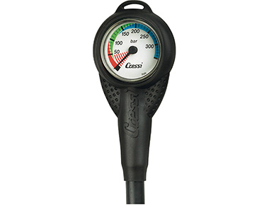 The Cressi mini pressure gauge is a small, light-weight gauge that has been specifically designed to avoid excessive strain on the HP hose that connects to the first stage of the regulator.
